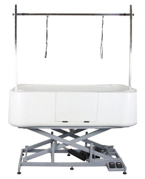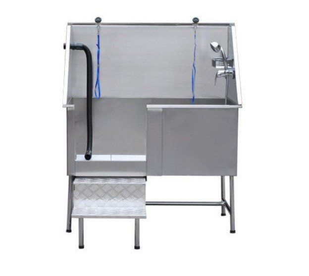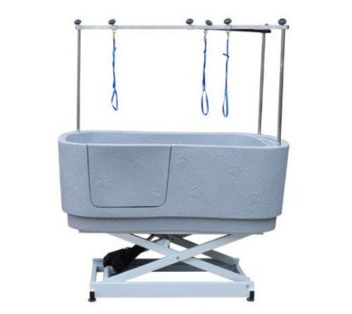 Höhenverstellbare PE-Kunststoff-Hundebadewanne, Aussenmasse 148x75/80 x 90/96, mit praktischem Fronteinstieg, Flaschen-Depot, 1/2 Zwischenboden
