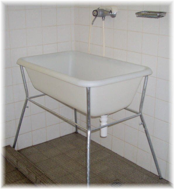 Hundebadewanne aus PE-Kunststoff weiß, 100 Li, bruchsicher, mit verzinktem Standstatif oder Wandkonsole, belastbar bis 150 KG, Aussenmasse:100 x 62x30 cm. Diese preiswerte,