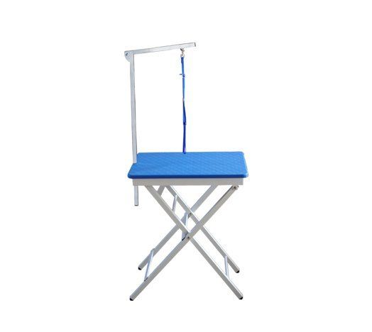 Handlicher, besonders bei Ausstellern beliebter, stabiler, faltbarer Trimmtisch mit rutschsicherem Gummibelag und Alu-Scherengestell